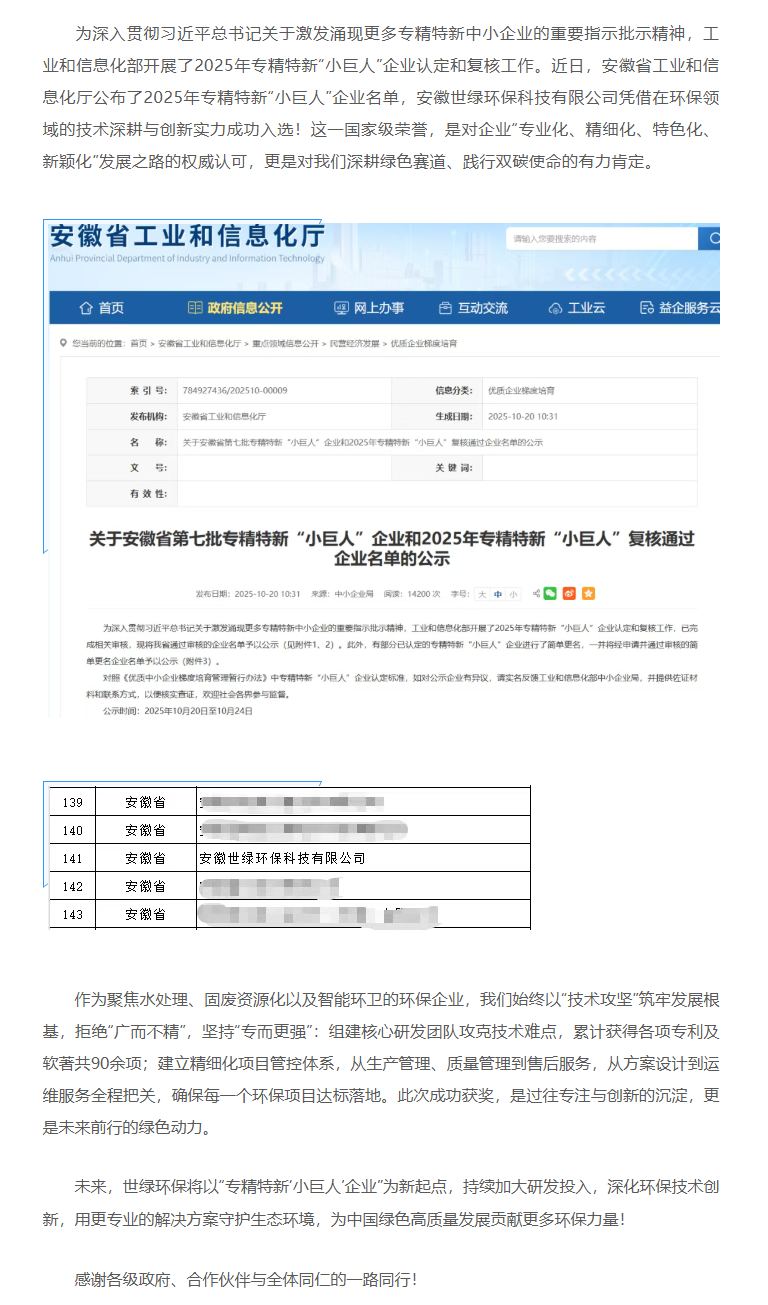 喜讯 | 世绿环保荣膺2025年国家级专精特新“小巨人”企业!